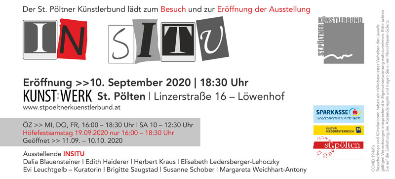 Am 10. September 2020 wird im KUNST:WERK St. Pölten im Löwenhof (Linzer Straße 16) um 18.30 Uhr – unter Einhaltung der aktuellen Corona-Regeln – die Ausstellung „In situ“ eröffnet.