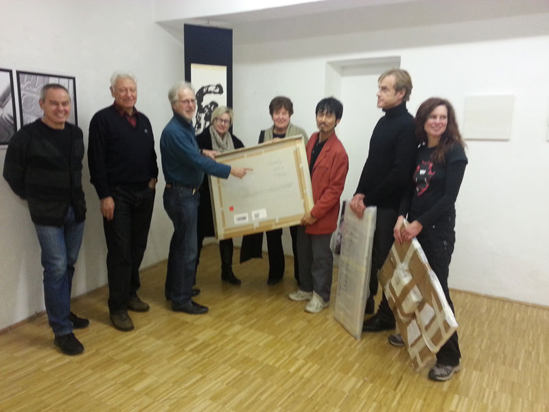 Hermann Fischl, Franz Rupp, Ernest A. Kienzl, Eva Bakalar, Hannelore Mann, Kurt Schönthaler und Margareta Weichhart-Antony übergeben ihre Bilder an den japanischen Kurator Yoshitaka Yokozawa, der eine große Ausstellung in Kurashiki anlässlich des Weltautismustages vorbereitet, zu der er auch die Mitglieder des St. Pöltner Künstlerbundes eingeladen hat.