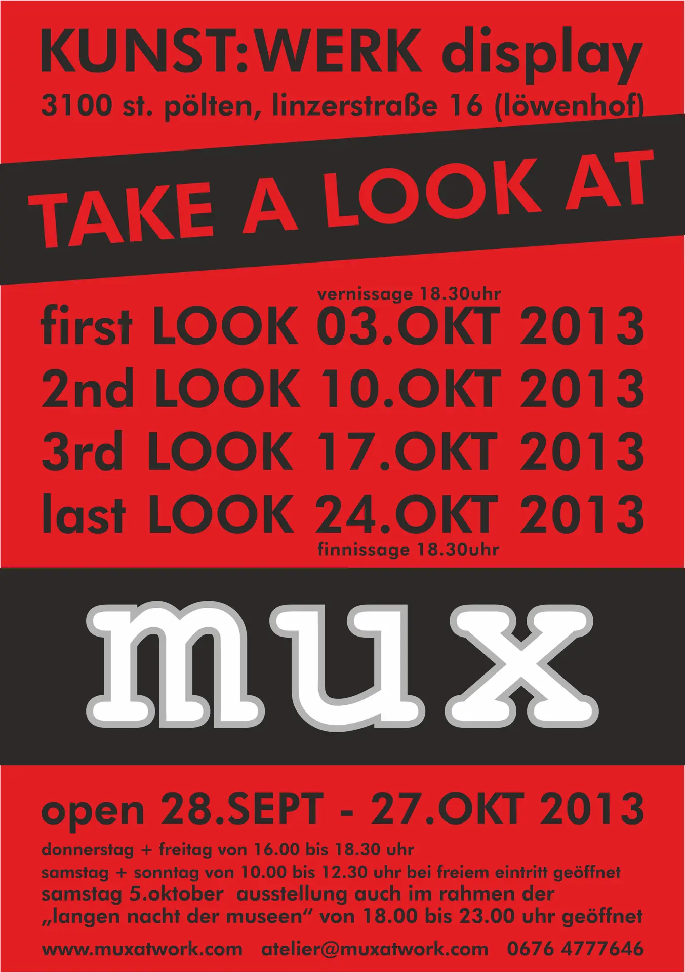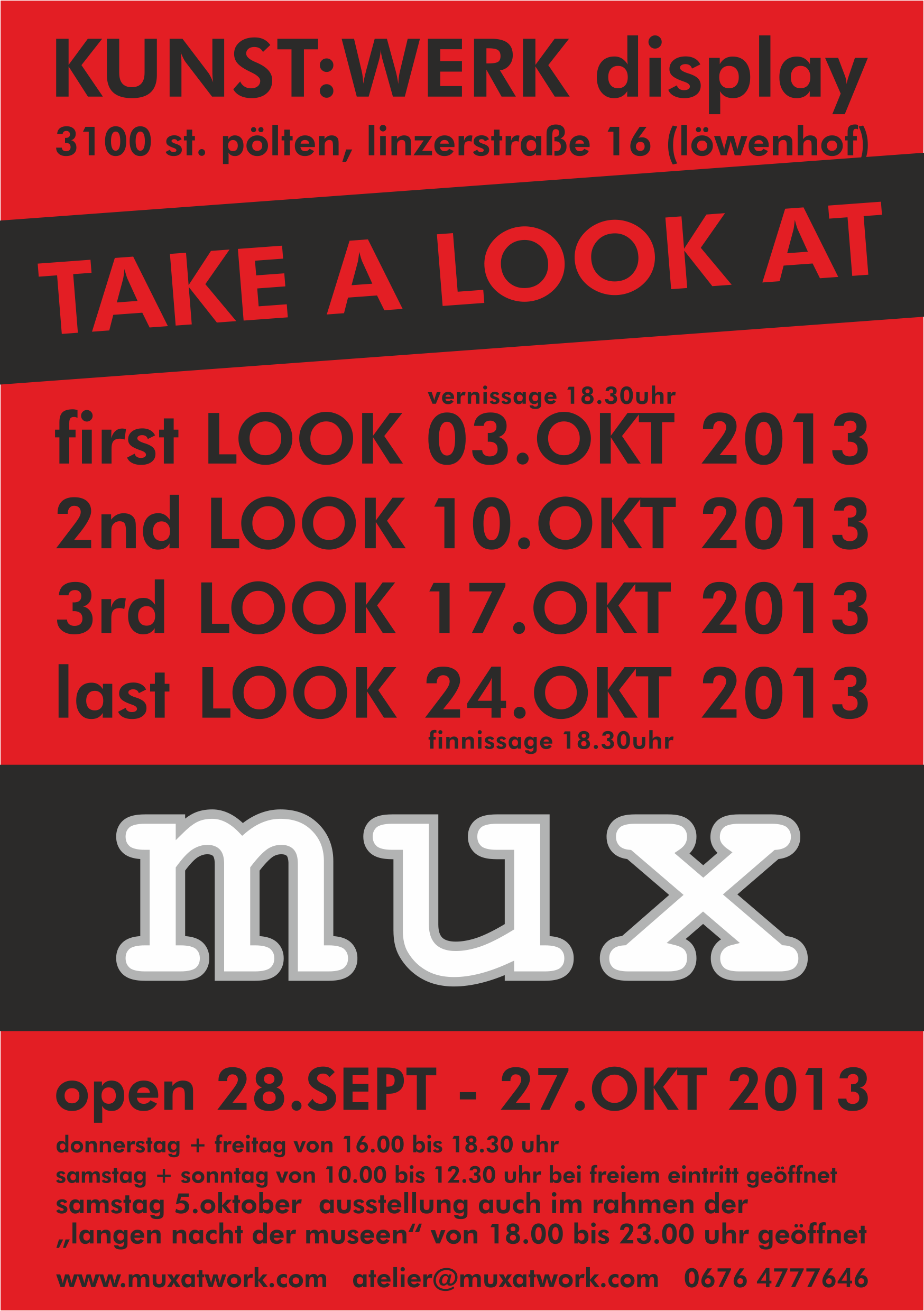 Am Donnerstag, 3. 10. 2013, eröffnet MUX – Margareta Weichhart-Antony um 18.30 Uhr ihre Ausstellung „TAKE A LOOK AT“ im KUNST:WERK-Display mit einem first LOOK.