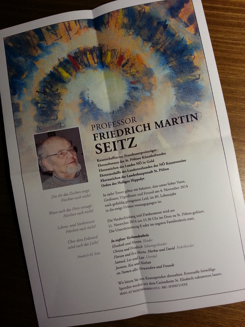Traurig geben wir die Nachricht, dass unser langjähriger Obmann und zuletzt Ehrenobmann Friedrich Martin Seitz am 4. November 2014 im 89. Lebensjahr gestorben ist.